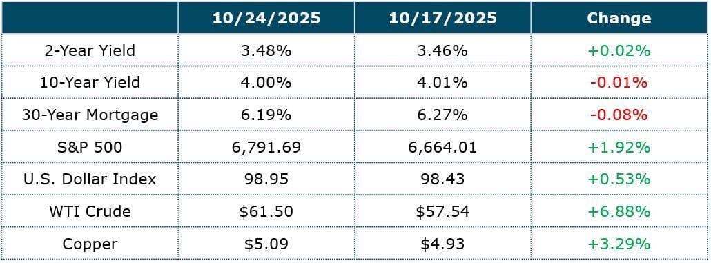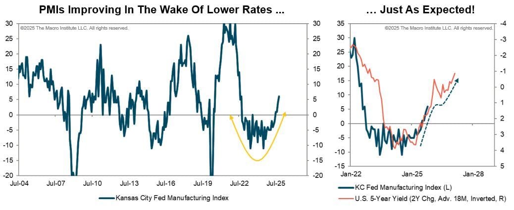 This week, our focus turns to the three regional PMIs being released. The Dallas Fed Index arrives Monday, followed by Richmond on Tuesday, and Chicago on Friday. Interestingly, last week’s Kansas City Fed reading was quite strong. If you remember the old Wall Street adage, “buy the smiles,” that’s exactly what it looked like. We don’t usually spend much time on this series, but it seems to be responding to the lagged effects of lower interest rates, as the clip above suggests. That would argue for more upside in the months ahead. For now, we’ll see if Dallas, Richmond, and Chicago echo that same constructive tone.